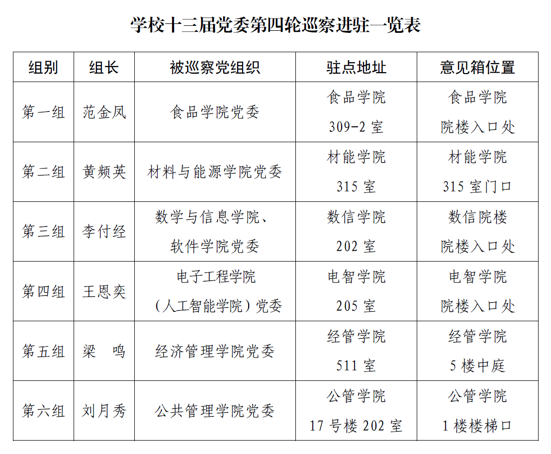 根据学校巡察工作部署,截至4月8日,学校十三届党委第四轮巡察的6个巡察组完成对食品学院党委,材料与能源学院党委,数学与信息学院、软件学院党委,电子工程学院(人工智能学院)党委,经济管理学院党委,公共管理学院党委等6个党组织的巡察进驻工作。