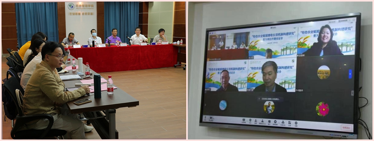4月16日上午,省社科联决策咨询研究基地华南农业大学农业产业发展研究中心发展研讨会暨国家社科基金重大项目“特色农业赋能增收长效机制构建研究”(21&ZD090)开题论证会在我校经济管理学院举行。会议采取“线上+线下”的模式同步进行。副校长仇荣亮出席并致辞。来自中国人民大学、浙江大学、同济大学、中国农业大学、南京农业大学、华中农业大学、西北农林科技大学、东北农业大学、辽宁大学、吉林农业大学、广东省农业科学院、中国社会科学报、南方日报、广州日报等十五位专家学者参加会议。