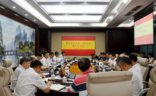 5月31日,我校党委书记王斌伟,中国科学院院士、亚热带农业生物资源保护与利用国家重点实验室(以下简称“国家重点实验室”)副主任、华南农业大学分室主任刘耀光,副校长仇荣亮一行18人赴广西大学,就国家重点实验室建设推进工作与广西大学进行深入研讨。广西壮族自治区政协副主席、广西大学党委书记王乃学,校党委副书记、校长韩林海等校领导接待了王斌伟一行,双方进行座谈交流。
