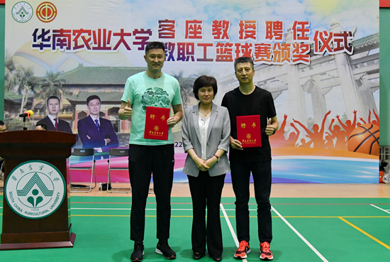 刘雅红对杜锋、郭士强加入华农表示热烈欢迎,并向两位客座教授颁发聘书。