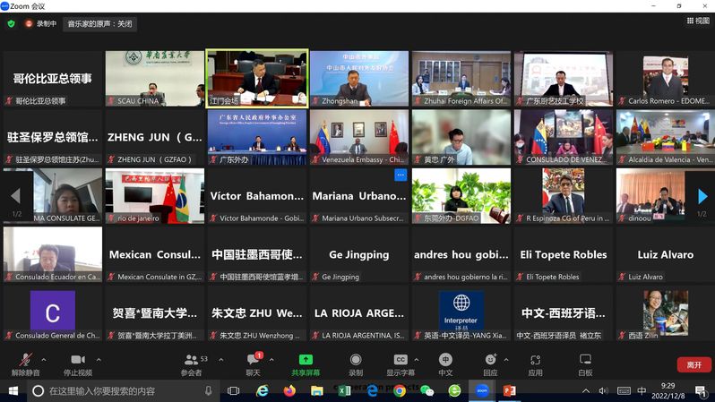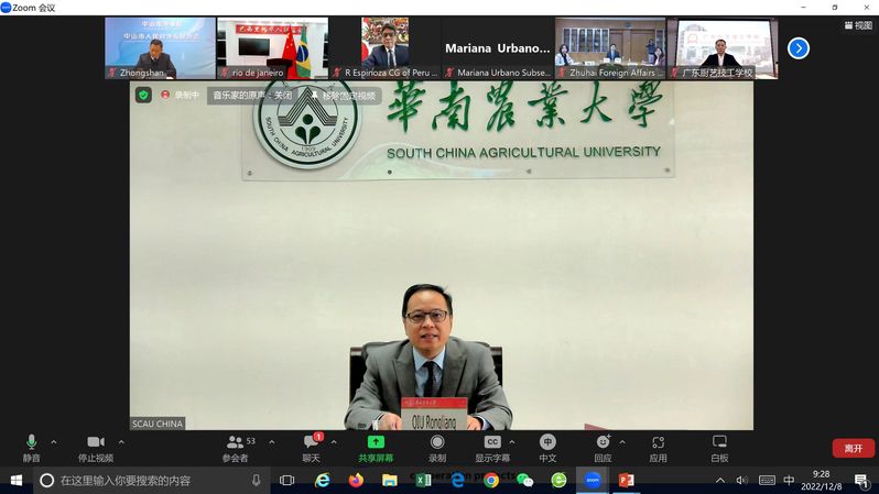 为进一步加深广东省与拉美国家友好城市的交流合作,12月8日上午,“2022广东拉美友城交流日”活动在江门市以线上线下相结合方式顺利举办。外交部拉美司、广东省外事办公室、江门市政府、中拉使领馆官员代表及粤拉友城官员代表等参加了会议。副校长仇荣亮代表我校和“中国—拉丁美洲农业教育科技创新联盟”(中拉联盟)参加活动并致辞。