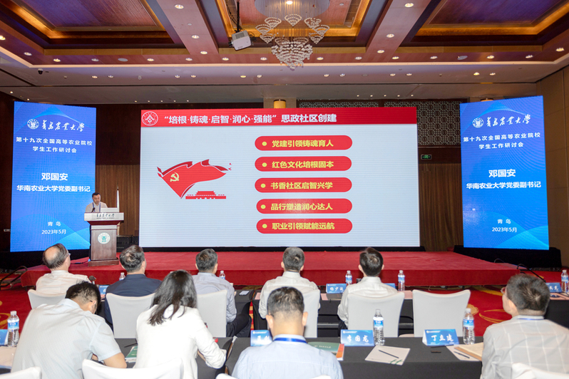 在经验交流会上,邓国安以《培根·铸魂·启智·润心·强能——华南农业大学思政社区内涵式建设的探索与实践》为题发言,从党建引领铸魂育人、红色文化培根固本、书香社区启智兴学、品行塑造润心达人、职业引领赋能远航5个方面具体介绍了我校思政社区内涵式建设的内容和成效。