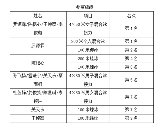 体育教学研究部有关负责人表示,学校游泳队将继续保持饱满的热情和高昂的斗志,科学训练、不断提升、勇往直前,为学校争取更多的荣誉。