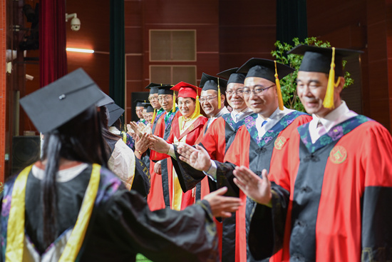 学位授予仪式上,校长刘雅红和校学位评定委员会委员为现场的毕业生代表授予学位并逐一拨穗。