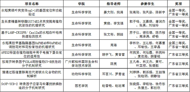 本届比赛共有来自全国562所高校12069个团队参与,我校共有来自生命科学学院、动物科学学院、园艺学院、广州都柏林国际生物科学与技术学院等9个学院组成的37支队伍报名参赛,并在此前举行的广东省决赛中获得一等奖4项、三等奖4项,我校获评优秀组织奖。