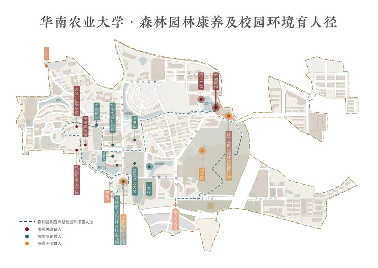 据介绍,华农森林园林康养及校园环境育人径主要围绕“校园自然育人”“校园历史育人”“校园思政育人”三大主题构建善境育人游线,以华农大牌坊为起点,环校园至西南门为终点,全长约5.5公里。其中,校园自然育人线途径湿地公园、树木园、善境花园、林学与风景园林学院等森林园林康养节点;校园历史育人线途径校史展览馆、华南农业博物馆、红满堂、农林讲习所门楼、校友花园、华农酸奶文化馆等标志性地点;思政育人主题则贯穿全线,涵盖丁颖纪念馆、昭阳湖院士广场、人文与法学学院廉政文化广场等地点。
