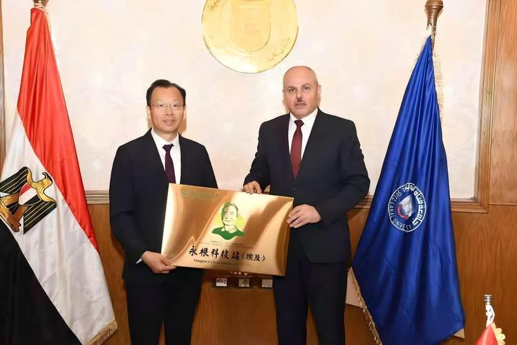 在位于埃及伊斯梅利亚市的苏伊士运河大学(Suez Canal University),该校校长、我校植物保护学院校友Nasser Mandour热情接待了代表团,并与李凤亮一行进行会谈。双方就推动师生互访、学分互认、联合学位项目,以及借助其孔子学院平台优势推进“中文+农业科教”项目等合作方向达成共识。双方举行了合作谅解备忘录签署仪式以及“永根科技站”成立揭牌仪式,该科技站将聚焦于旱区节水农业、园艺作物新品种新技术、植物保护、荒漠化治理等,开展关键技术研发与示范,服务埃及和中东地区应对严峻的生态环境挑战。代表团还考察了苏伊士运河大学实验农场、埃中应用技术学院和孔子学院。