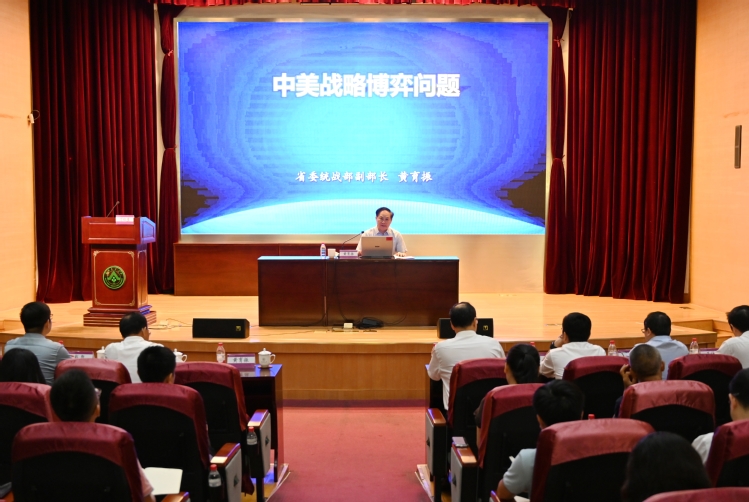 会上,黄育振紧紧围绕习近平新时代中国特色社会主义思想和习近平总书记在纪念中国人民抗日战争暨世界反法西斯战争胜利80周年大会上的重要讲话,以中美战略博弈为切入点,运用大量详实资料和数据,对当前国际政治焦点、中国周边安全形势、中美军事力量进行系统分析,全面阐述了在新时代新征程中强化底线思维、认清风险挑战、保持战略定力、做好应对准备的方式方法,强调构建全民国防体系,充分发挥强军兴军“定海神针”的重要性。整场报告案例鲜活、数据详实、语言精辟、逻辑严密、讲解深入浅出,对学校干部师生进一步增强国家安全意识、认清国家安全形势、了解国家安全体系,具有很好的启示作用和教育意义。