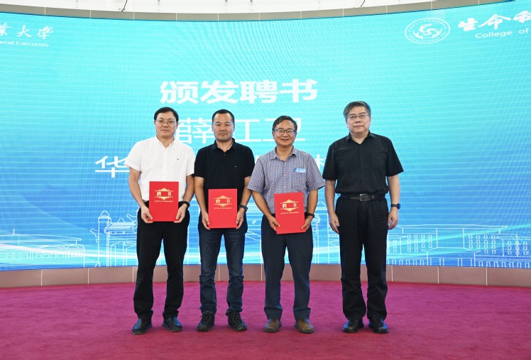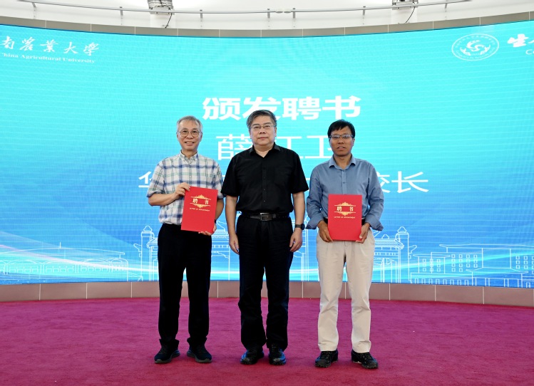 校长薛红卫为研究院学术委员会委员田志喜(右一)、林汉明(左一)颁发聘书