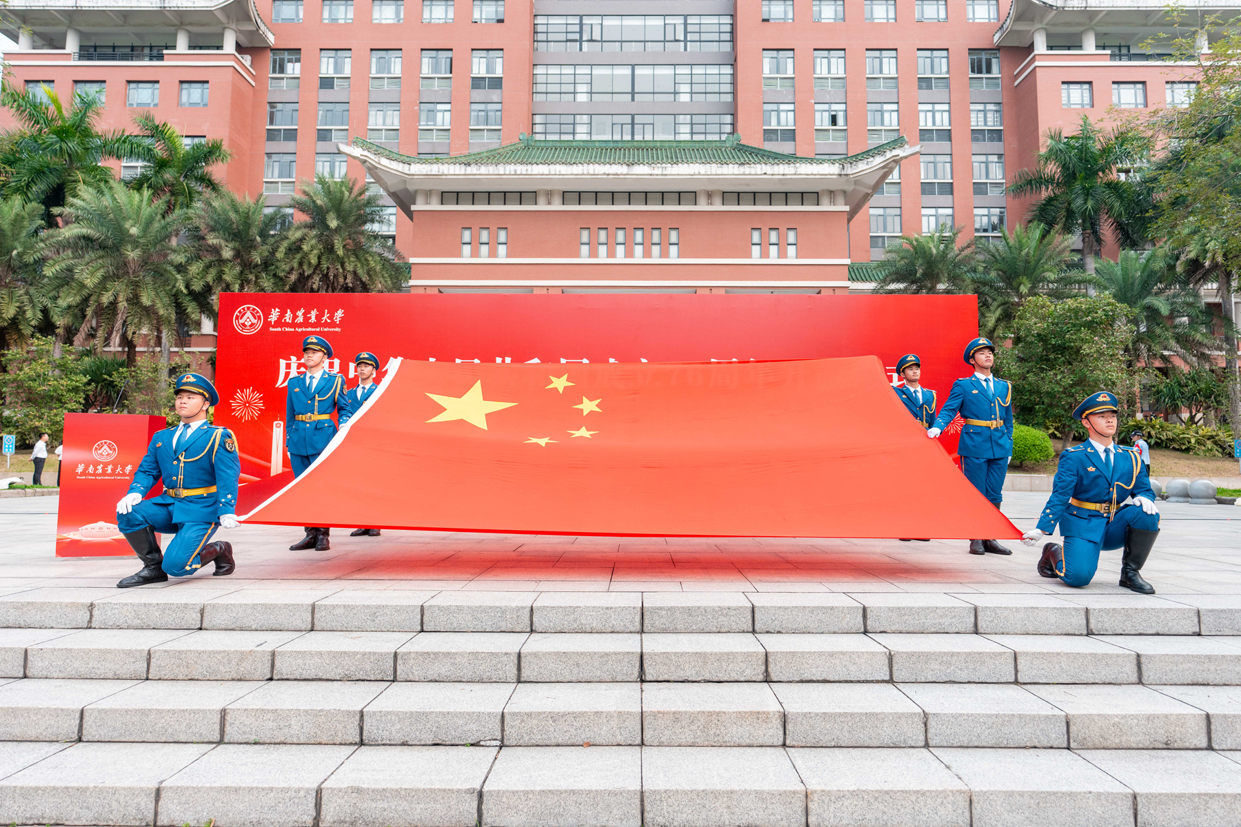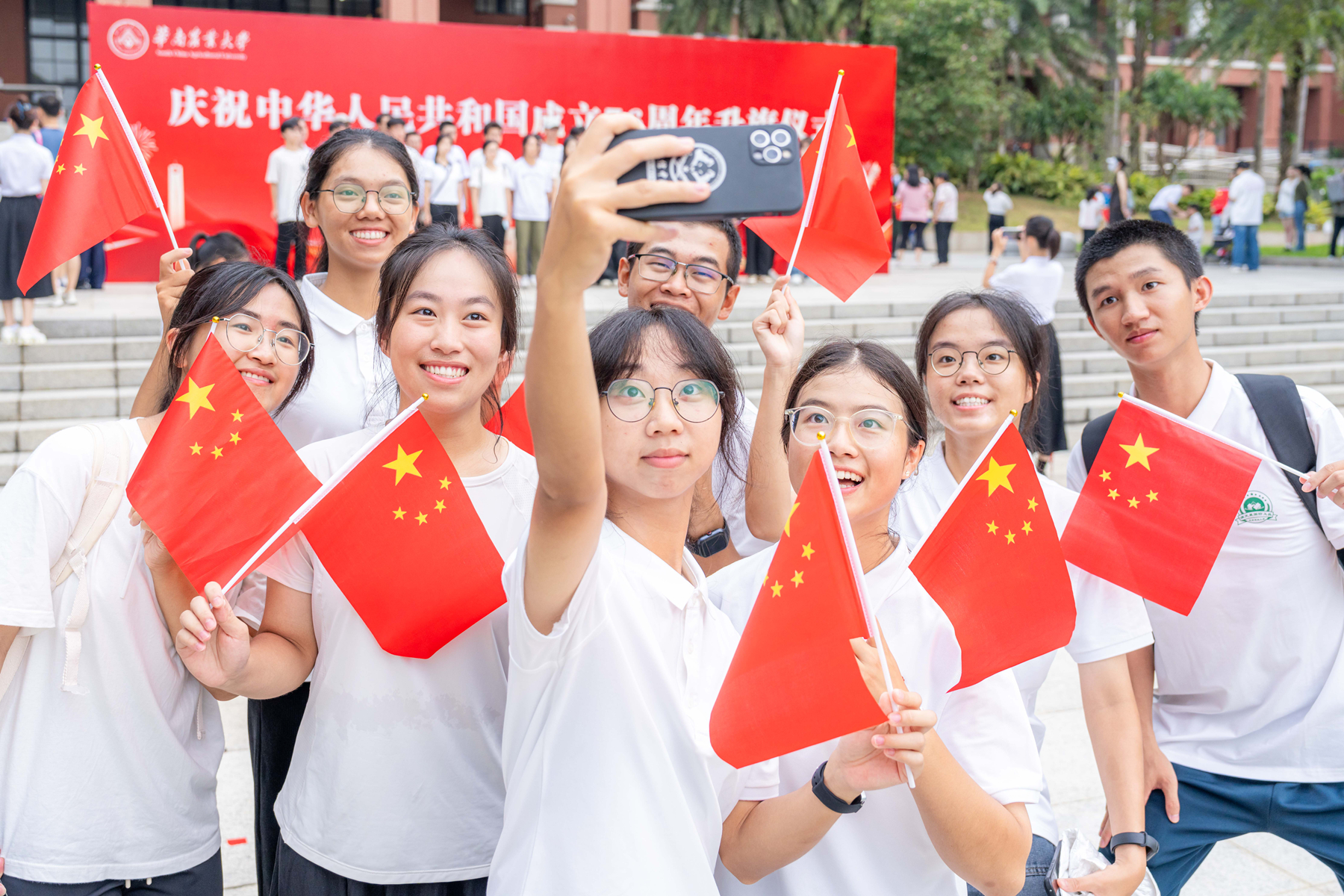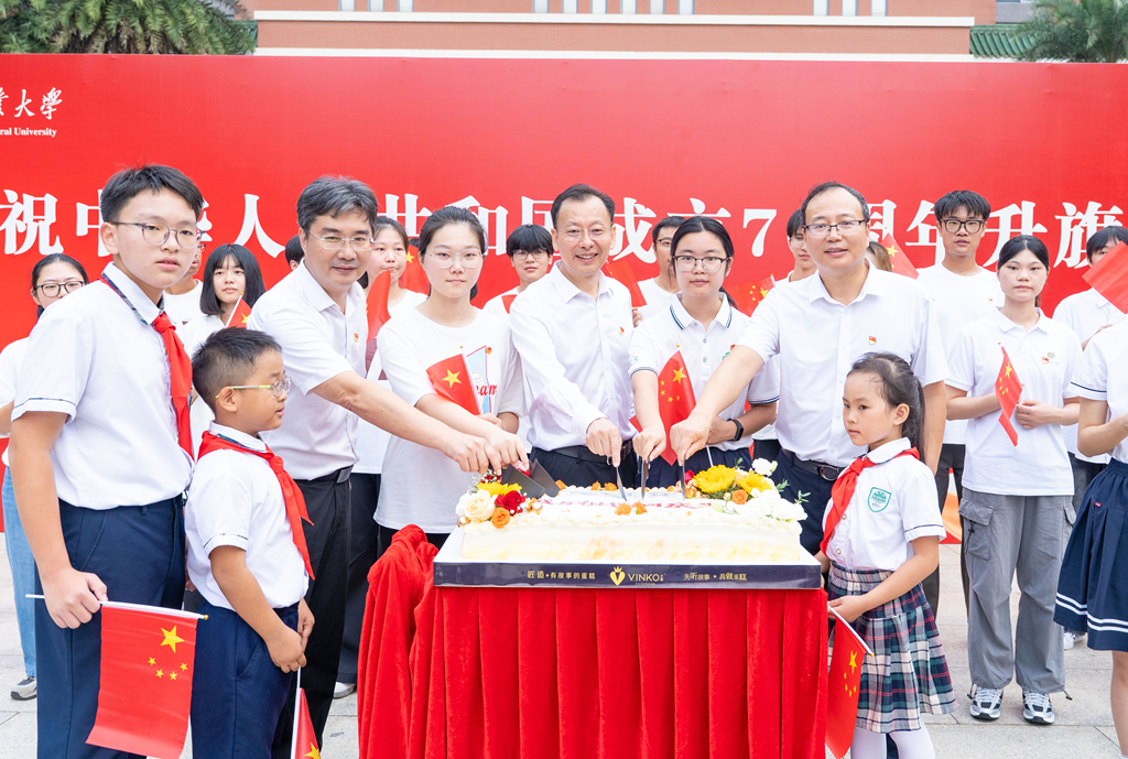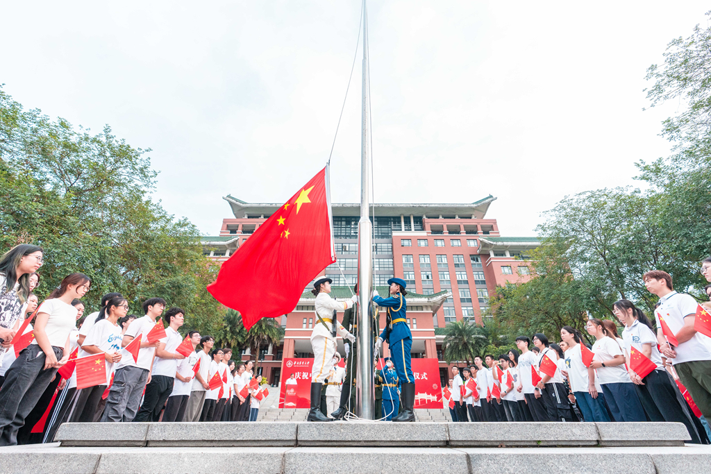 10月1日,华南农业大学在行政楼广场隆重举行升旗仪式,近千名师生共同见证五星红旗冉冉升起的庄严时刻,并手持国旗合唱《歌唱祖国》,“花式”举牌表白祖国。当天生日的大、中、小学生代表在现场“与祖国同庆生”。