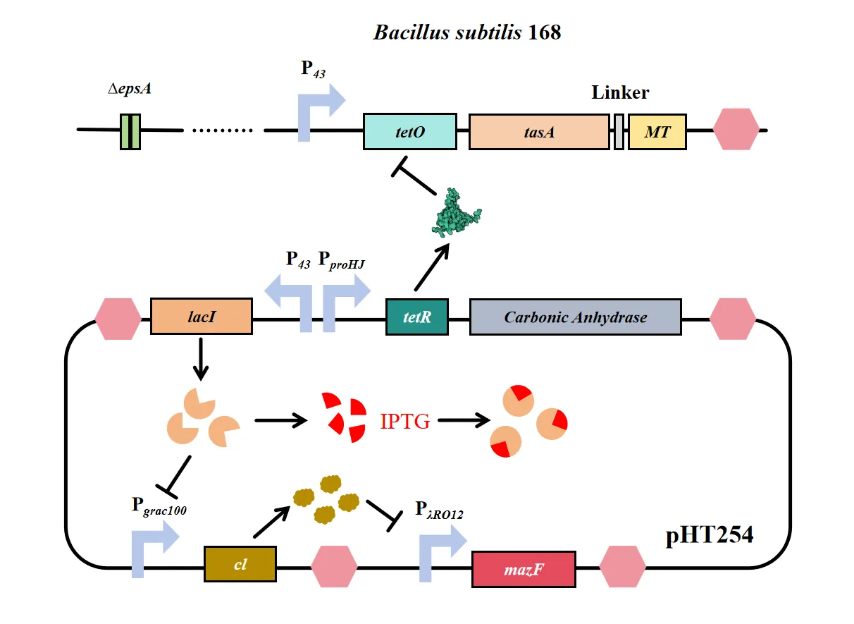 项目所设计的基因线路使金属硫蛋白ShMT3与生物膜蛋白TasA融合表达,在ΔsinR-tasA ΔepsA三突变底盘中形成高密度吸附网络,同时利用大语言模型挖掘的渗透压响应启动子PproHJ结合四环素非门构建双向开关,在低潮低盐环境下优先表达TasA-ShMT3进行吸附,在高潮高盐触发下激活碳酸酐酶Dsp-aCA催化生物矿化,通过沉淀Ca/Mg碳酸盐将重金属永久封存。