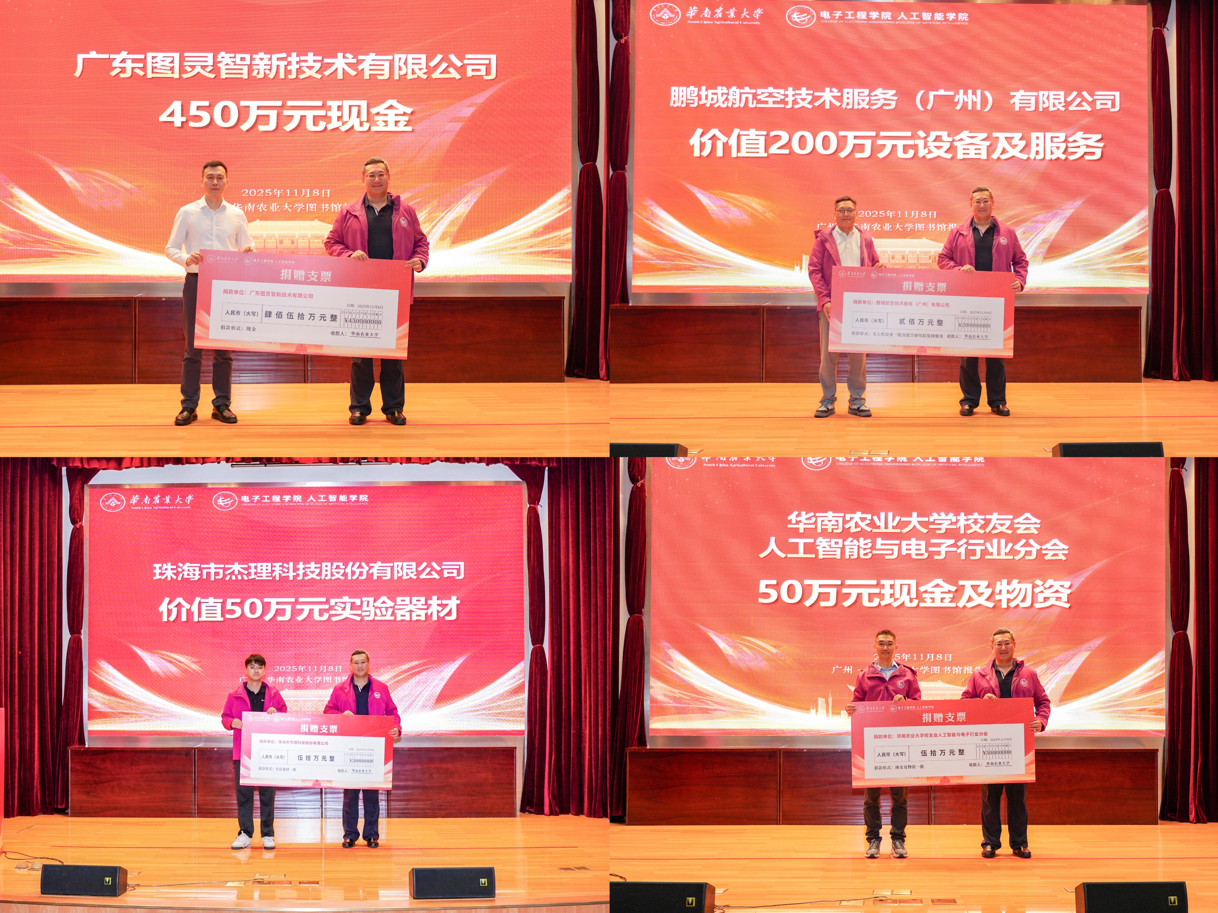 为支持学校教育事业发展,广东图灵智新技术有限公司捐赠450万元现金,鹏城航空技术服务(广州)有限公司捐赠价值200万元的设备与服务,珠海市杰理科技股份有限公司捐赠价值50万元的实验器材,华南农业大学校友会人工智能与电子行业分会捐赠50万元现金及物资,捐赠总额达750万元。