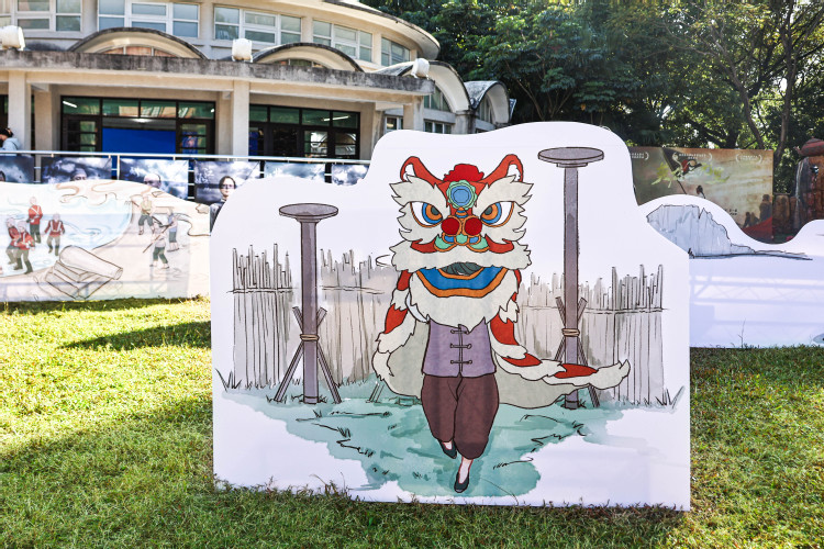从手握醒狮头的小女孩、扛着三星旗的义士,再到抗击外敌的英雄,绘本中的角色变身立牌,挺立在红满堂前,向来宾们重述着那段可歌可泣的史诗。场外主题打卡框前,学子们手持美术绘本,或驻足观赏,或合影留念,将三元里的这段传奇铭记在心。