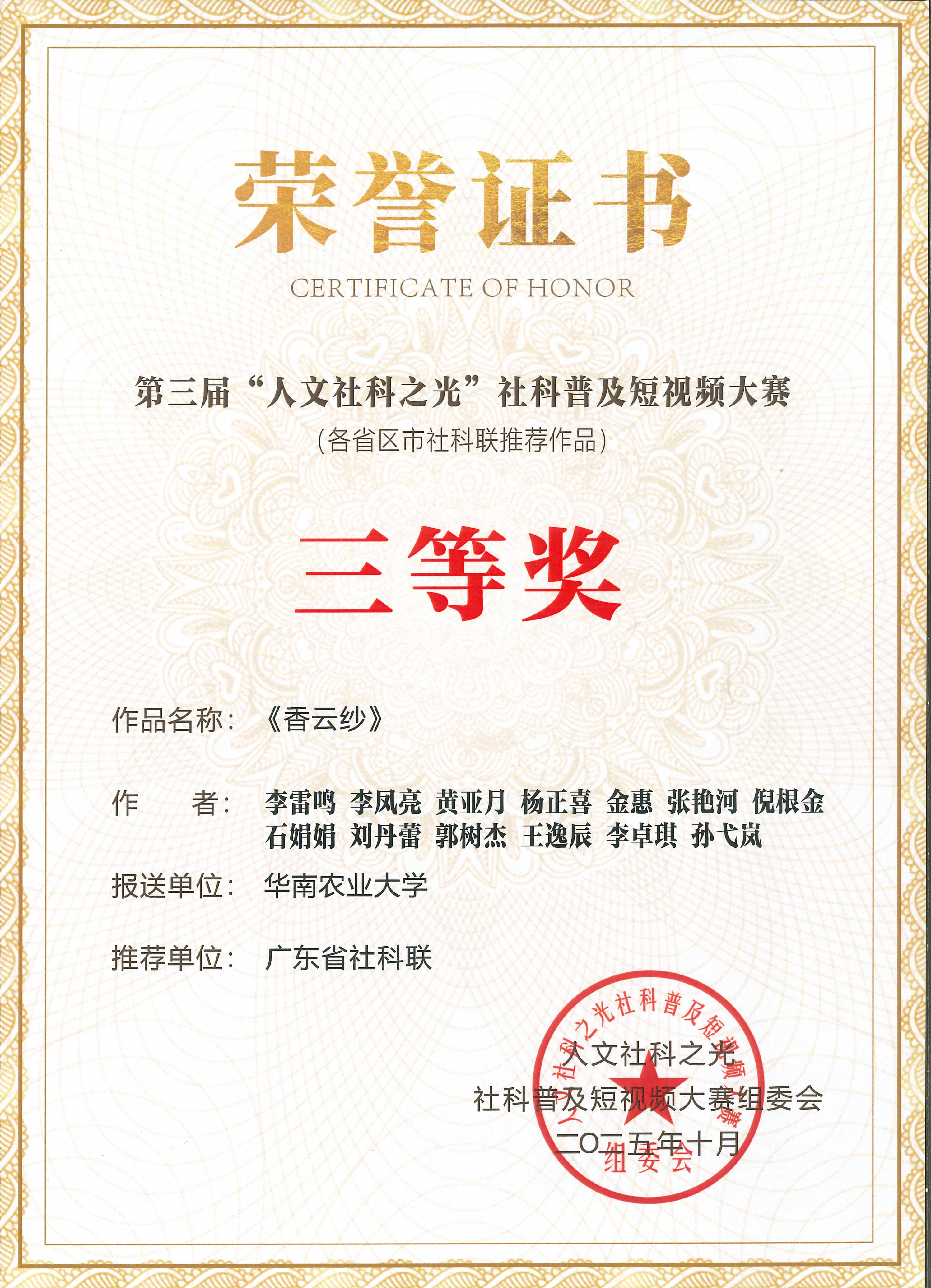 近日,全国第三届“人文社科之光”社科普及短视频大赛评选结果揭晓,华南农业大学作品《香云纱》荣获三等奖。