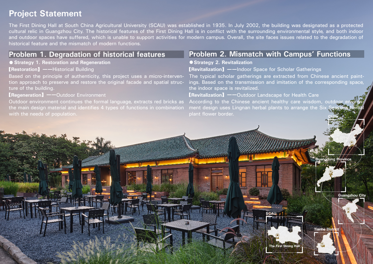 据介绍,华农酸奶文化馆前身为中山大学乙组膳堂,始建于1935年,由著名华侨商人胡文虎、胡文豹兄弟捐建,2002年7月被列为广州市第六批文物保护单位。2023年2月,历经两年改造升级,华农酸奶文化馆正式开放营业。项目由广州华农大食品科技有限公司委托、广东华农大城市规划设计研究院有限公司施工,涵盖整体风貌协调、户外环境再生、建筑本体修缮以及室内空间活化四部分设计内容,以微介入的方式对建筑本体进行修缮,在保护了文物建筑遗产风貌的基础上,以风景园林手法主导整体历史环境更新,激活紧邻学生社区的历史空间,营造服务师生的校园文化生活场所,传承华农文脉,弘扬校园文化,使华农酸奶文化馆成为广受师生欢迎的校园新地标。