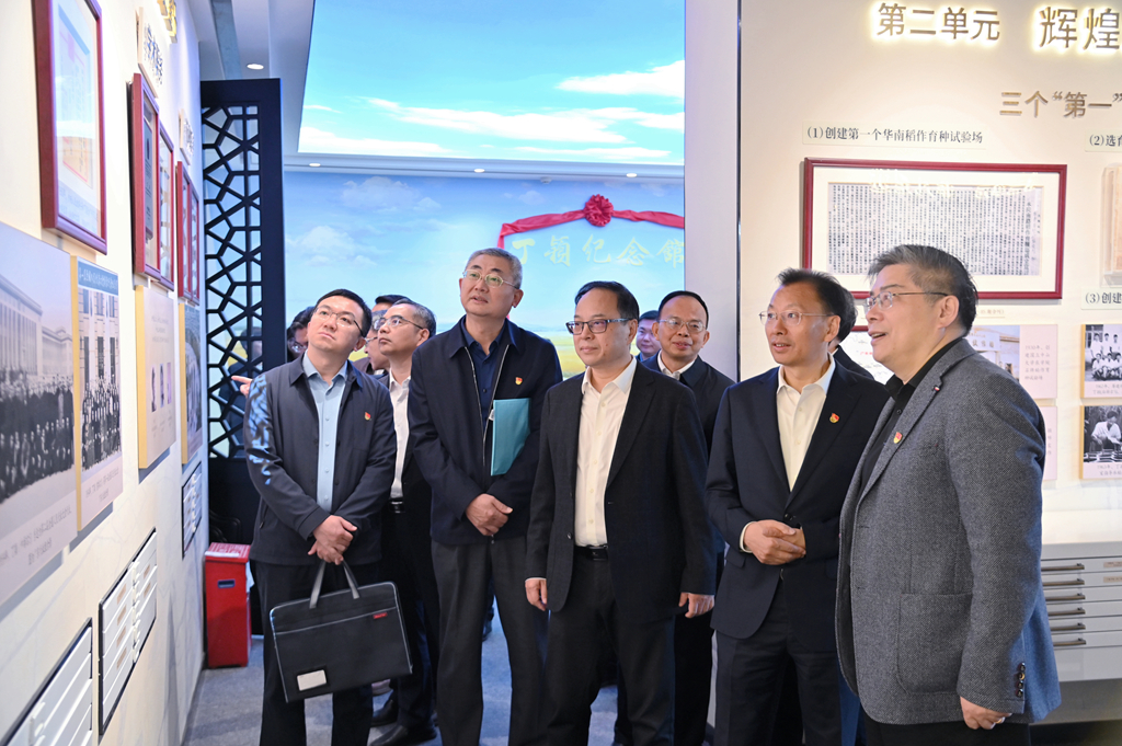 校党委书记李凤亮,校长薛红卫,校党委副书记丁红星、陈磊,副校长温小波、杨运东、仇荣亮、钟强、陈乐天为新升级的丁颖纪念馆、卢永根先进事迹陈列展揭牌。校党委理论学习中心组(扩大)学习会集中学习了展馆内容,深刻感悟丁颖、卢永根等老一辈科学家筚路蓝缕、笃行实干的崇高精神。