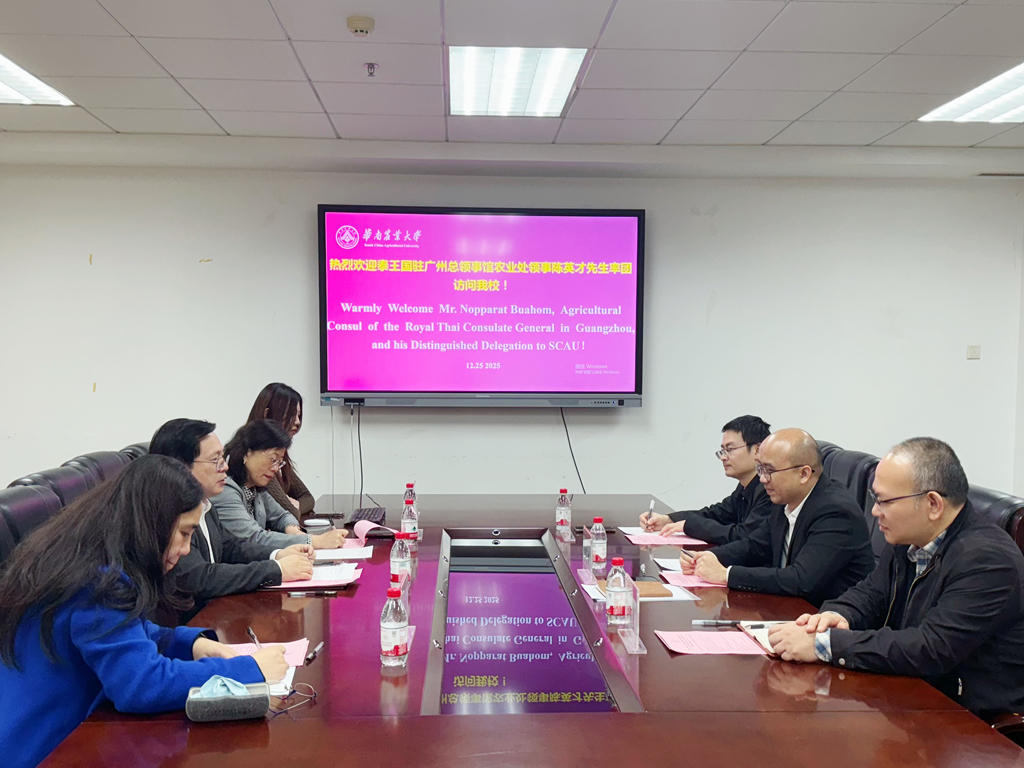 12月25日,在中泰建交50周年之际,泰国驻广州总领事馆农业处领事陈英才(Mr. Nopparat Buahom)率团来访华农。学校国际交流处接待来宾并座谈,双方围绕农业科研、人才培养等议题进行了深入座谈交流。