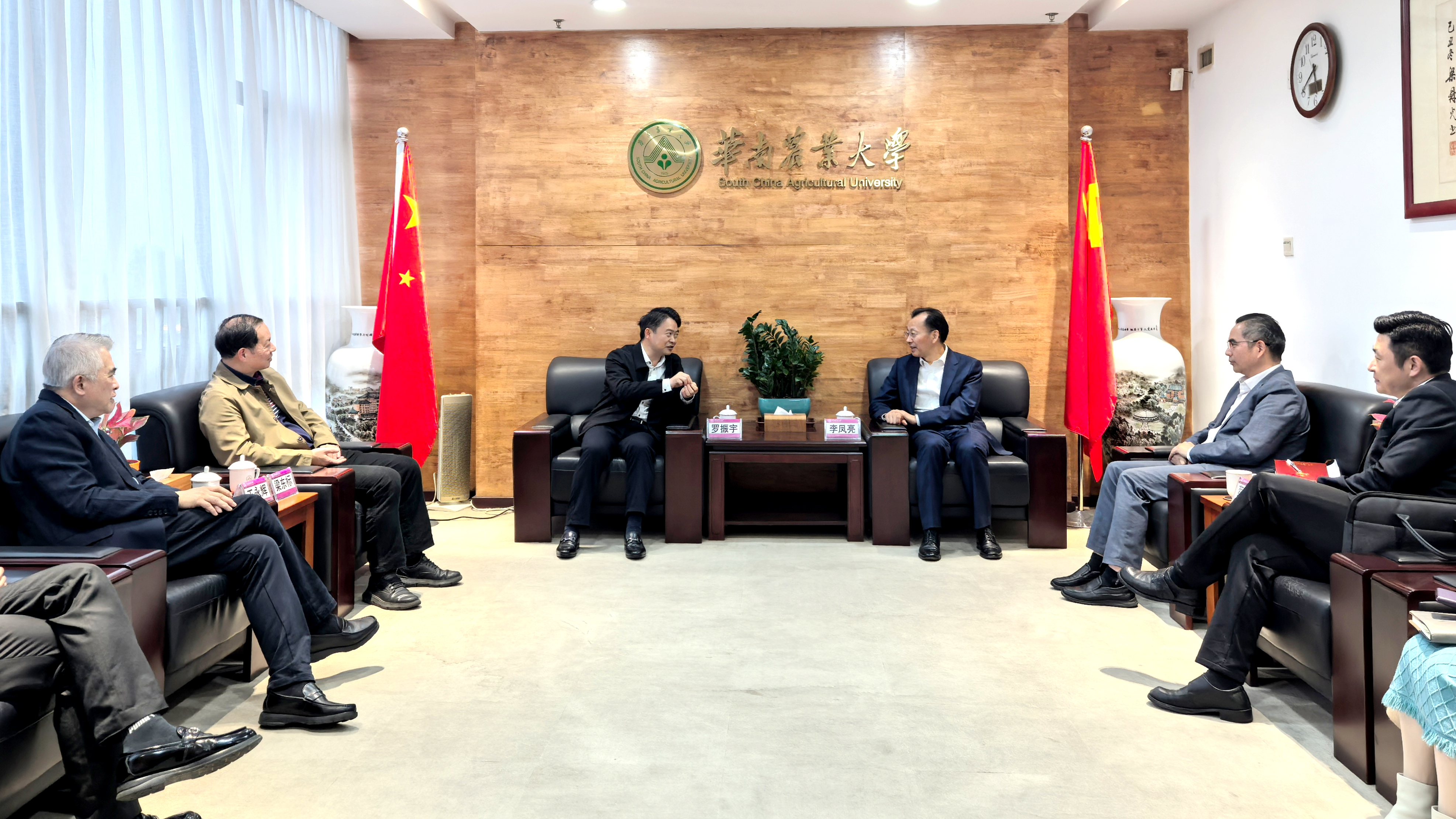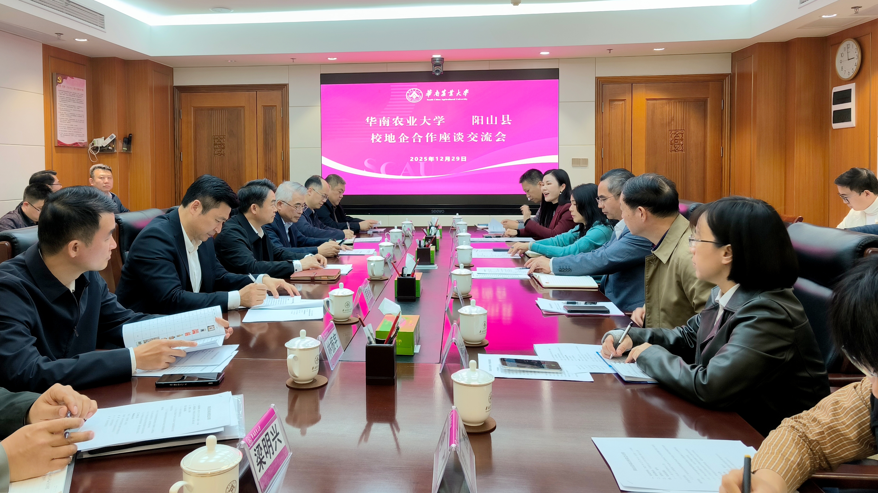 为深入贯彻落实广东省“百县千镇万村高质量发展工程”,深化“双百行动”校地合作,12月29日,华南农业大学与阳山县在学校行政楼七楼会议室召开校地企合作座谈交流会,会议聚焦“农产品加工及食品产业高质量发展”主题,旨在多方聚智赋能,助力阳山县域经济高质量发展。阳山县县长罗振宇,广州卫生职业技术学院党委副书记梁东标,广东省农业科学院蚕业和农产品加工研究所副所长邹宇晓,广州市香雪制药股份有限公司董事长王永辉等各方代表出席会议。华农党委书记李凤亮会见了罗振宇一行,副校长陈乐天接待来宾并座谈。
