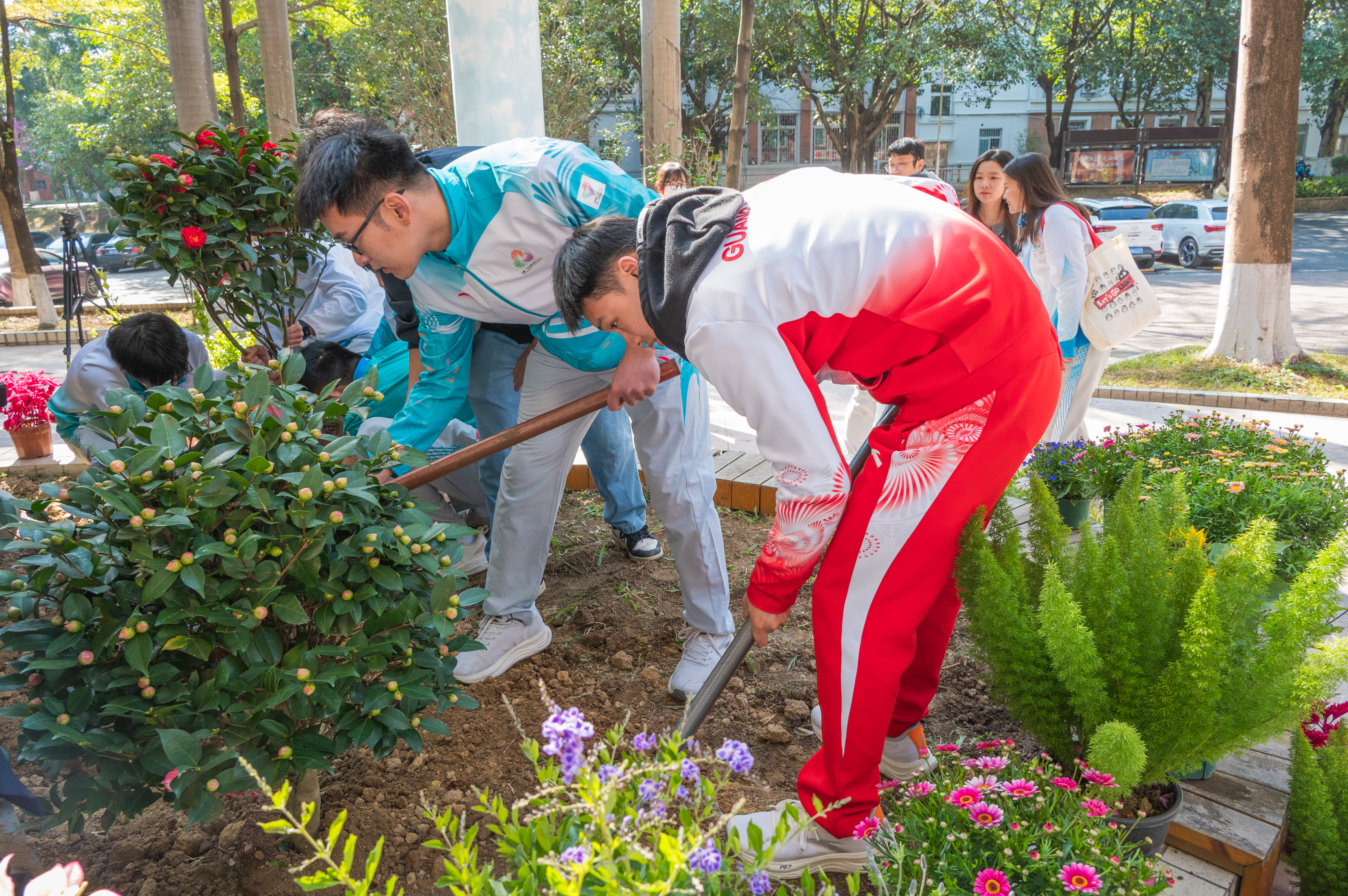 会上,陈艾森受聘学校体教融合特约辅导员,并为华农服务十五运会和残特奥会师生宣讲团授旗。会后,陈艾森还参加了绿化志愿服务,与同学们一起在华山学生活动中心广场打造了承载特殊记忆的“冠军志愿者花坛”。
