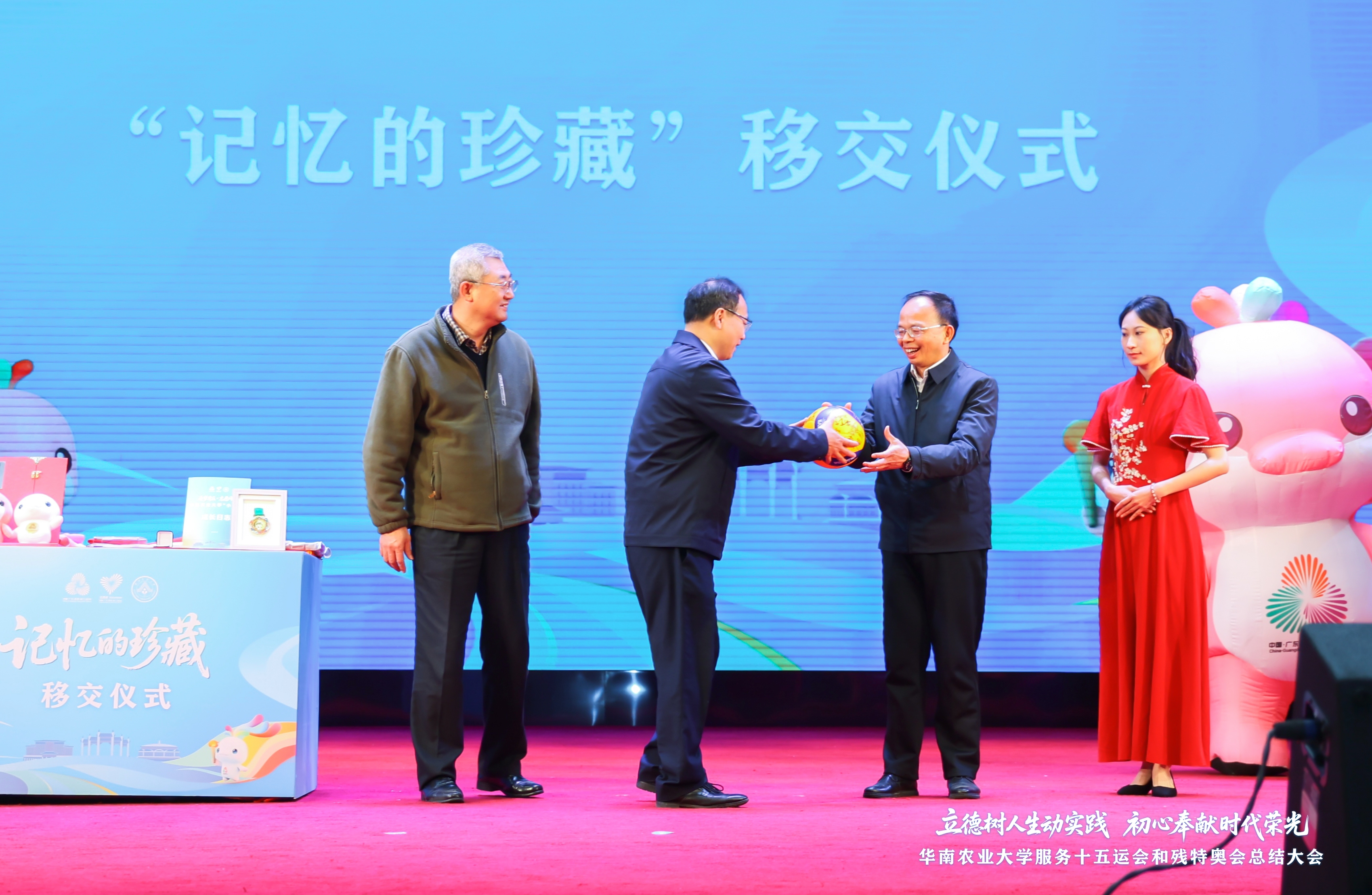 “记忆的珍藏”移交仪式上,十五运会排球(男子20岁以下组、男子18岁以下组)、残特奥会坐式排球竞委会将十五运会排球(男子20岁以下组)冠军浙江队的签名排球、赛会旗帜、志愿者服装、“小海豚”志愿者日志等一批具有纪念意义的赛事物品捐赠给华农校史馆,以此铭记华农师生的赛事奉献。
