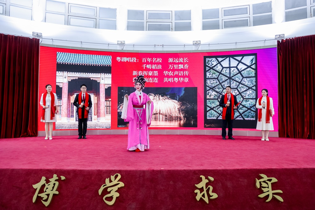 现场,广州粤剧院国家一级演员、广州市级非物质文化遗产项目(粤剧)代表性传承人、学校文化艺术专家委员会委员吴非凡与师生代表花式演绎诗朗诵《稻浪里的硬核与温柔》,校艺术团带来民乐演奏《赛马》、傣族舞蹈《花漾》,艺术学院教师献唱歌曲《思念》,年度总结视频生动呈现学校2025年高光时刻。