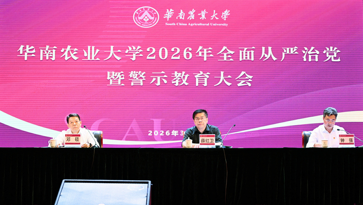 3月23日,华农召开2026年全面从严治党暨警示教育大会,总结2025年学校全面从严治党工作,安排部署2026年学校全面从严治党工作任务,开展学校全面从严治党、树立和践行正确政绩观学习教育及以案促改警示教育。受校党委书记李凤亮委托,校党委副书记、校长薛红卫作讲话,全面部署学校全面从严治党各项工作。省纪委监委驻华农纪检监察组组长,校党委常委、纪委书记邓硕作工作报告。校党委常委、副校长钟强主持会议。