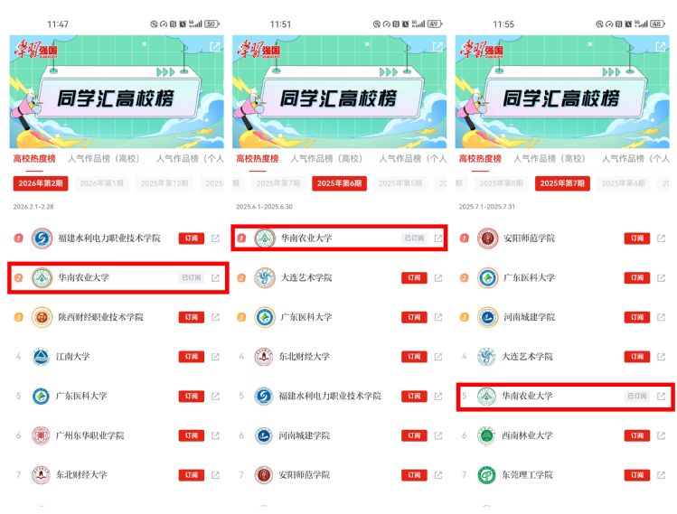 自2025年6月广东高校首个“学习强国”同学汇学生工作站落地华农以来,学校以工作站为核心思政育人阵地,深耕青年传播领域,打造优质内容矩阵,在同学汇高校榜单中屡创佳绩、持续领跑。