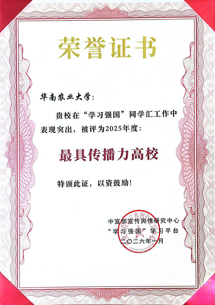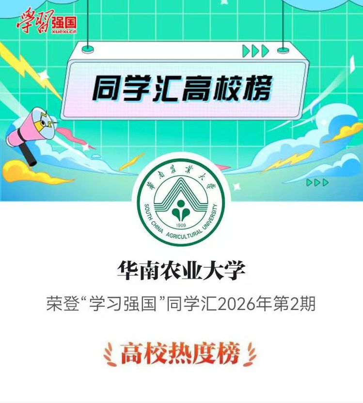 日前,“学习强国”学习平台发布2026年2月高校热度榜50强,我校再度跻身全国榜单前列,斩获第二名佳绩,同时学校作品《华农和知名摄影师定格岭南春日绝色风光》斩获高校人气作品榜榜首,以优质内容创作与鲜明校园特色,彰显百年高校的文化底蕴与青年传播力量。