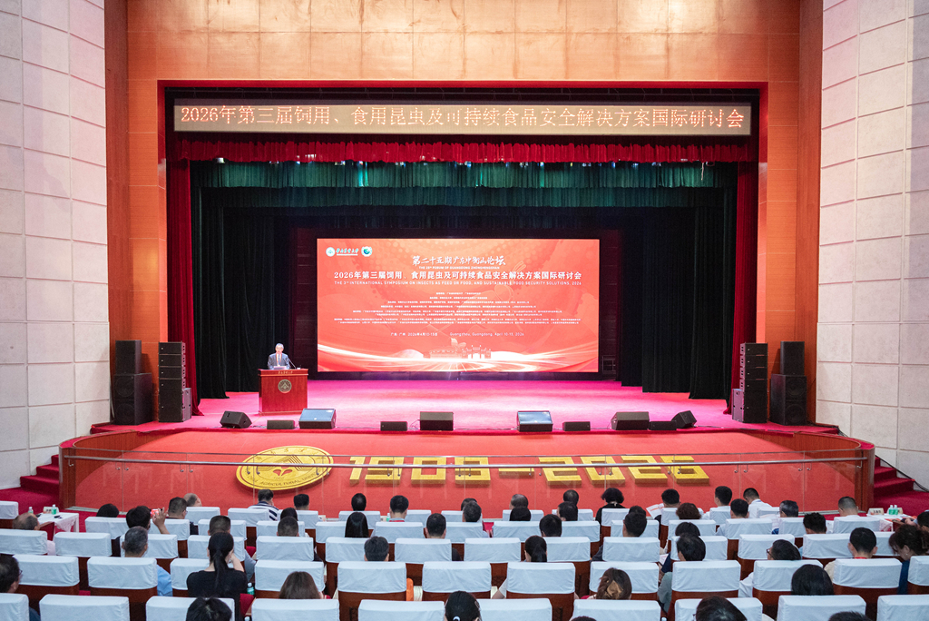 现场试吃油炸蟋蟀、昆虫蛋白面包点心、黑水虻蛋白饲养的猪肉…… 为深入践行大食物观,推动替代蛋白尤其是昆虫蛋白产业高质量、可持续发展,为全球蛋白短缺问题提供可持续解决方案,4月11日,第25期广东中衡山论坛——2026年第三届饲用、食用昆虫及可持续食品安全解决方案国际研讨会在华南农业大学举行。来自中国、荷兰、德国、爱尔兰、意大利、埃及、巴基斯坦、马来西亚、新加坡等国家,以及中国香港地区的300余名专家学者、企业代表、行业管理者及在读研究生齐聚一堂,聚焦昆虫蛋白这一绿色新型蛋白资源,共商产业高质量发展路径。现场还设置了由各类昆虫制作的创意美食,直观展现“虫子变蛋白”的产业化成果。